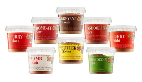 Flavours | NEW – 50g Morrocan RUB (6's), NEW – 50g Tandoori Spice (6's), NEW – 40g Lamb RUB (6's), NEW – 80g Breyani Masala (6's), NEW – 50g Curry Mild (6's), NEW – 40g Curry HOT (6's), NEW – 50g Butter Chicken (6's), NEW – 40g Bombay Curry (6's) |